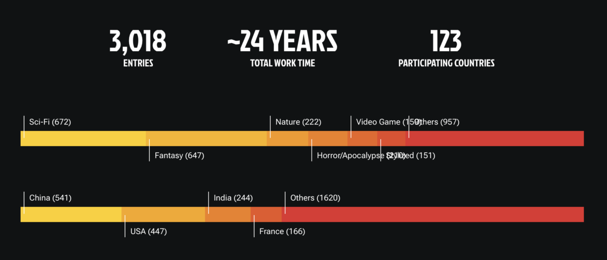 Au final, plus de 3 000 artistes de 123 pays différents ont participé et soumis leur travail en totalisant près de 24 années de travail commun. La Chine et les USA sont loin devant en termes de participants mais la France n'est pas en reste avec 166 projets envoyés.